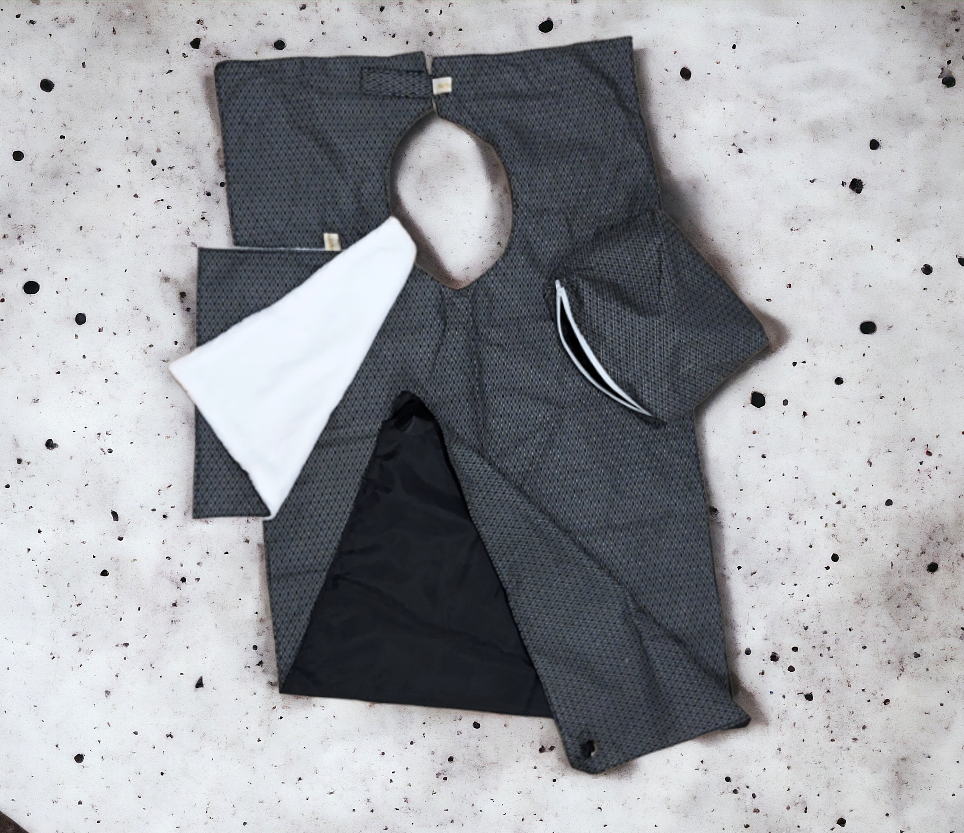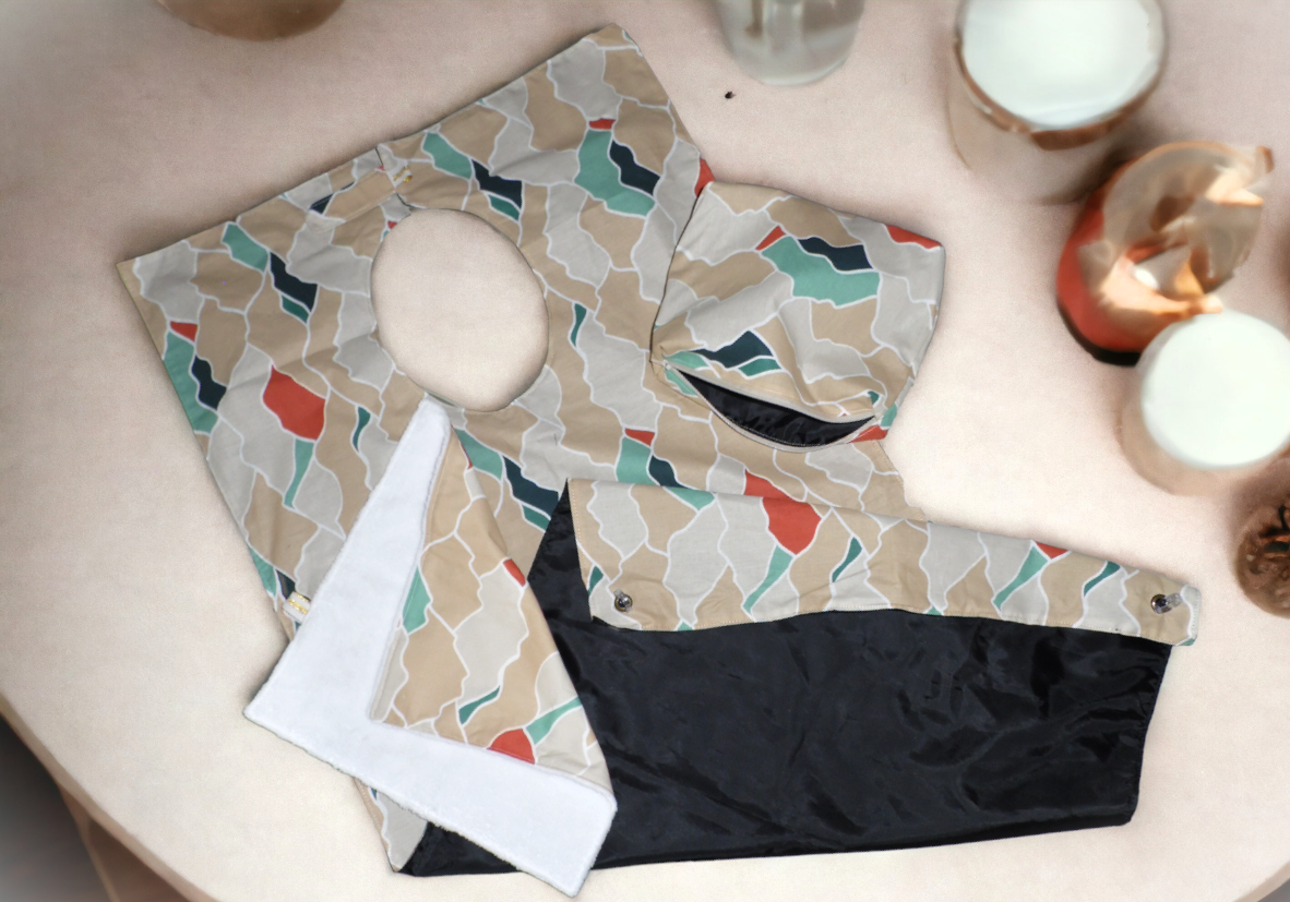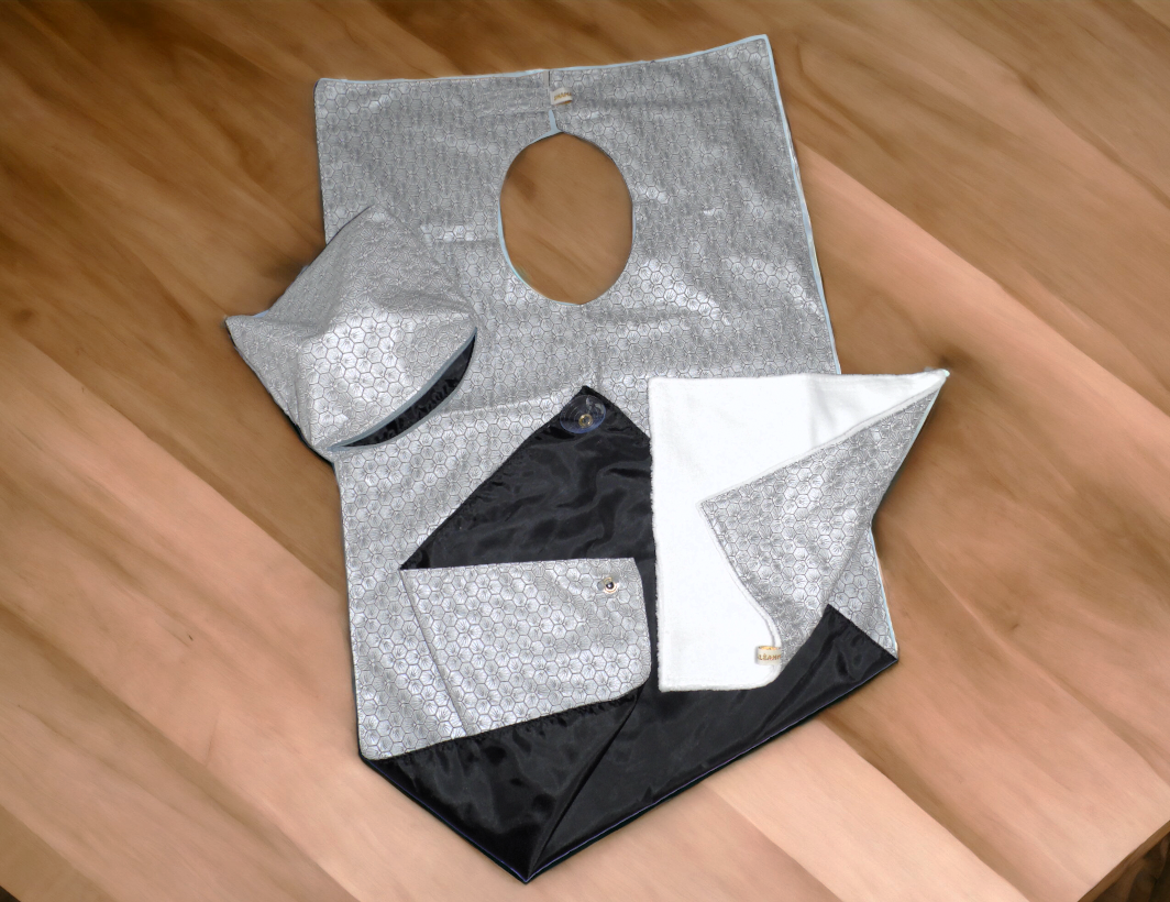 - Kit complet : tablier avec ventouses, serviette douce pour le visage et pochette de rangement pratique.